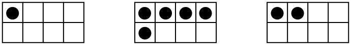 Decide on a frame size, say 8. Draw three frames on a shared piece of paper. The players select which role they will play– the Filler tries to fill each box, and the Emptier tries to empty each box. For each frame, roll the die once and put that many tokens in it. Here are three 8-frame boxes with starting rolls 1, 5, and 2.