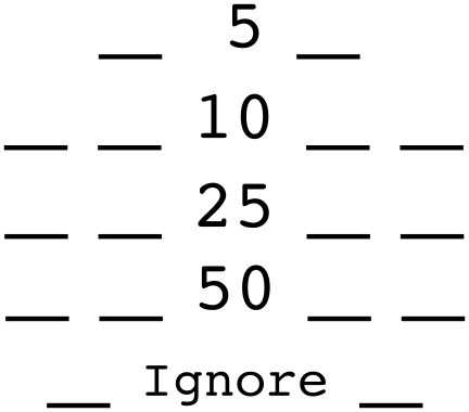 Write the numbers 5, 10, 25, and 50 vertically on a piece of paper. Put a single blank space on each side of the 5, and two blank spaces on each side of the other numbers. One player fills in the blanks on the left side