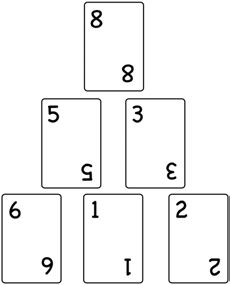 The goal for each player is to create a 6-card pyramid where each card is the sum of the two cards below it. The example above is almost complete- the player just needs to fix the left-hand corner to be a 4 so that the 5 will be the sum of 4 + 1. The first player to achieve a completed pyramid wins.