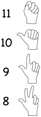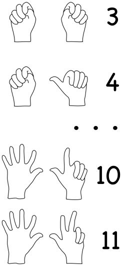 Take Away (on the left): Start with a closed fist and say ‘11.’ Then, lifting one more finger each time, count ‘10, 9, 8.’ When your student sees 3 fingers raised, the counting stops. You now have the result that taking 3 away from 11 leaves 8.