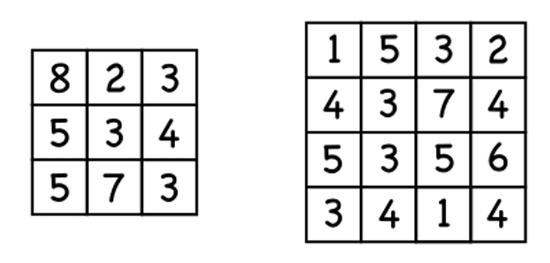 These puzzles reinforce adding and number bonds in a fun way, and they are easy to make. Pick a target number such as 10. Take a blank 3 by 3 or 4 by 4 board and fill it with pairs or triplets that add up to the target number– the numbers in a group must border each other. If you use the target number in the board (together with 0), that will give your students a simple place to start.