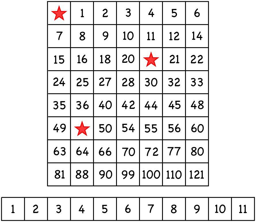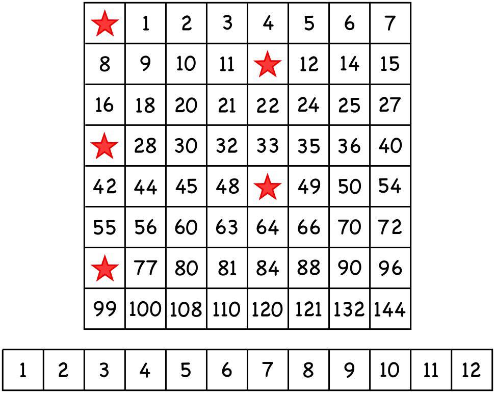 Use a board with the product numbers mixed up to give your child better practice identifying the products. The last two pages have examples of what the boards look like for using ranges of 1-10, 1-11, and 1-12. For boards that have red stars, a red star may be used by either or both players at any time.