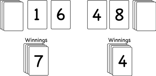 Flip over the top two cards from each pile and multiply each pair of cards. The player with the larger product keeps all four cards. In the example below, the player on the right wins with 4 x 8 = 32 against the left player’s 1 x 6 = 6. If the products match, flip over the next two pairs of cards and the winner gets all eight cards.