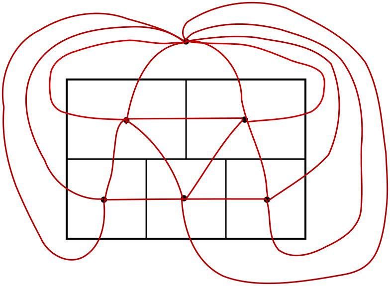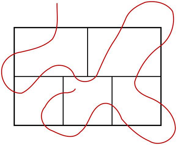 The red path is an attempt to find a parade route that crosses each edge of this diagram exactly once. Alas, one of the sides has been missed!