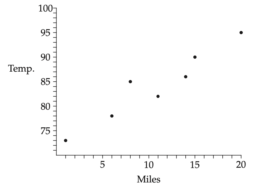 That last list of temperatures makes it clear that the temperature is generally going up as the cities get farther inland. However, if we use a scatterplot, the relationship becomes much clearer. Scatterplots are what most people think of when they think of a graph, and they can be very useful. You can do lots of examples of scatterplots with your child: graph height versus age; graph daily temperatures for a week; graph energy used in your home versus the high temperature for the day.