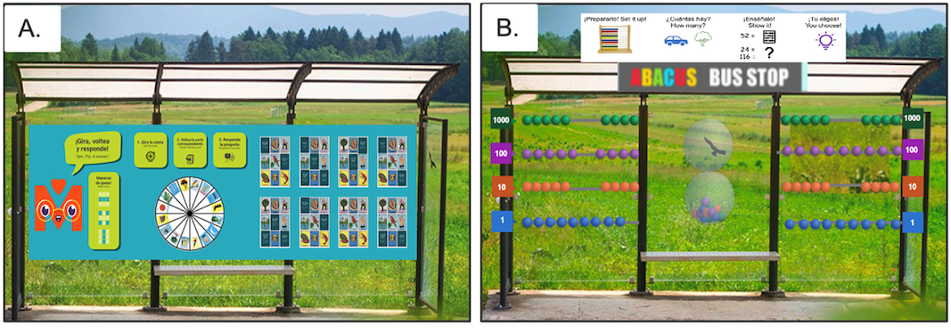 Putting up a math game, such as tic-tac-toe, in playgrounds is becoming more common. Here is an example of a child reading about how weights compare on earth and on the moon.