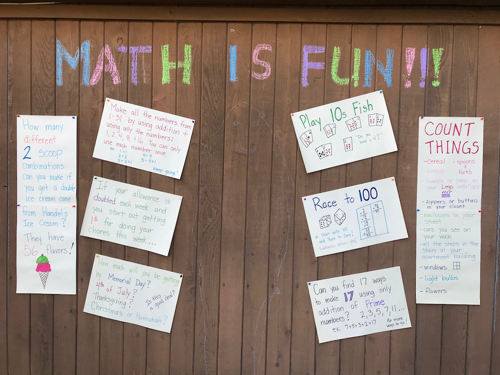 Whether you are an individual or part of a bigger institution, there are ways for you to display your joy in doing math and to invite other people to enjoy this wonderful journey with you. Sparking curiosity and interest in your own neighborhood is a great way to get the ball rolling, and who knows where it might lead! Maybe you can have a neighborhood math block party?