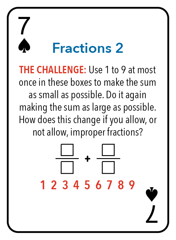 The 7 of Spades gave us a chance to discuss what made fractions larger or smaller. The Jack of Hearts developed some number sense about factoring.
